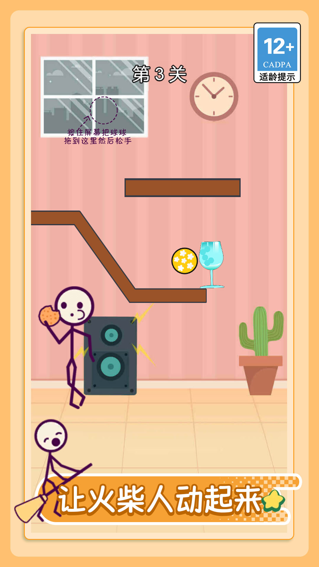 2、快速进入第一关,将小球拖到指定位置后放手进行下落,撞击杯子即可。