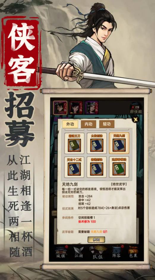 侠客与江湖是一款武侠主题的竞技冒险游戏,古色古香的游戏画风,玩家将化身为初入江湖的侠客,百种武学自由的学习,结识新的侠客开启新的冒险,这里没有命中注定的救世主,只有一个刚刚下山的少年侠客,以及一卷由你亲手书写的武功秘录与恩怨情仇,不仅是一款武侠游戏,更是一座活的武林博物馆,一次从微末到宗师的完整人生模拟。