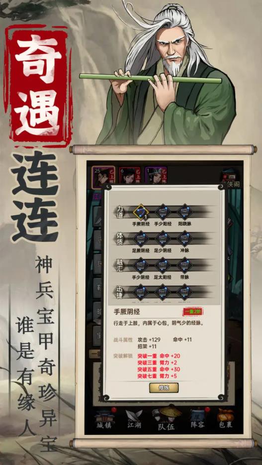 2、站桩、打坐、挑水、劈柴,最基础的修行积累内功根基,通过门派传授、奇遇获得、击败对手偷学等方式收集武功碎片;