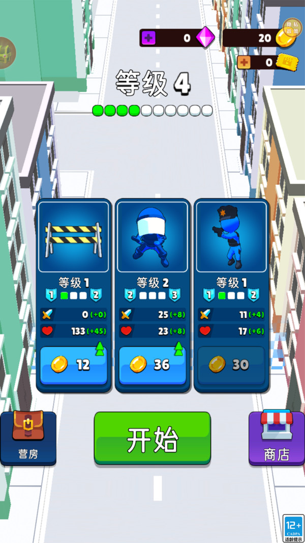 3、利用过关获得的金币,你可以对不同的路障警员进行升级,提升攻击力以及血量属性。