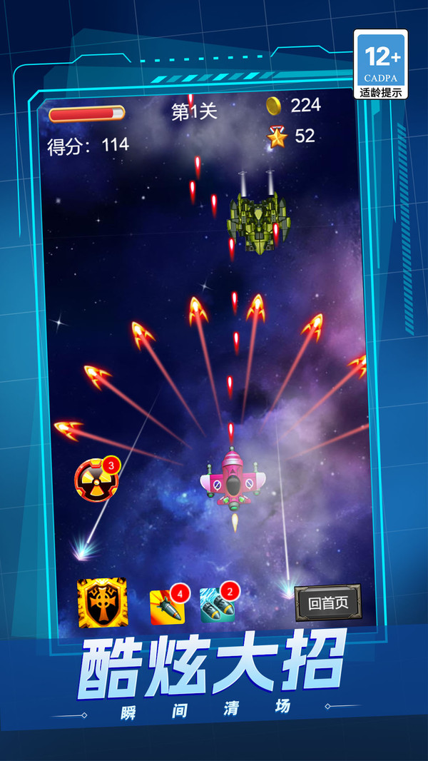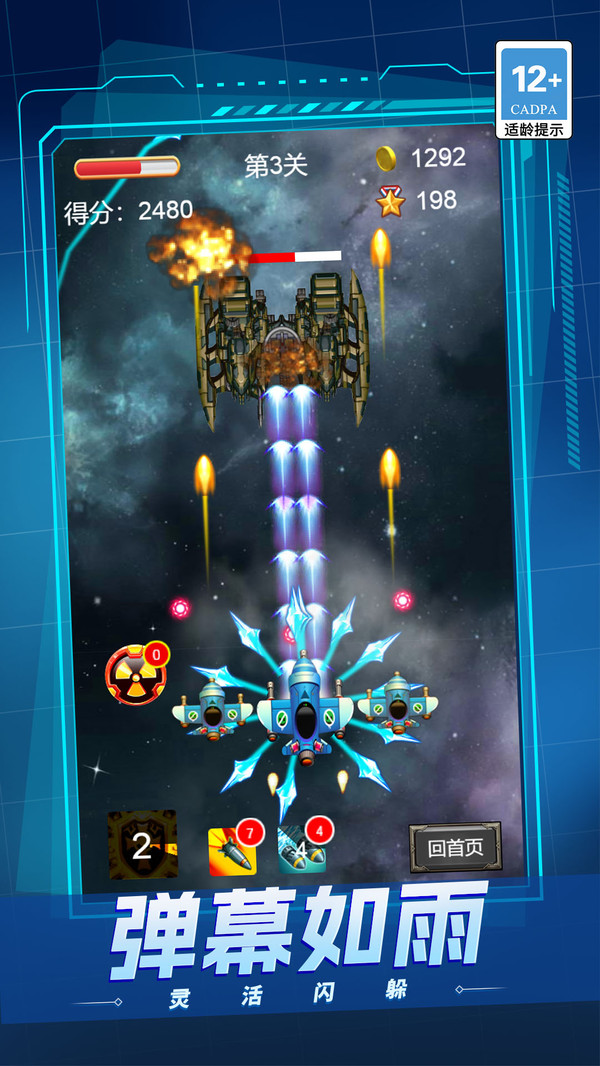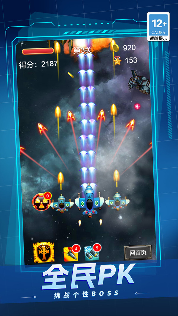 3、成功完成关卡可获得资源,用于在机库中升级炸弹威力、飞机生命值、机动速度或解锁全新机型。