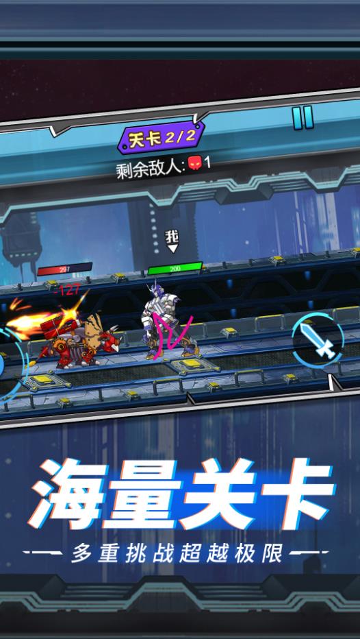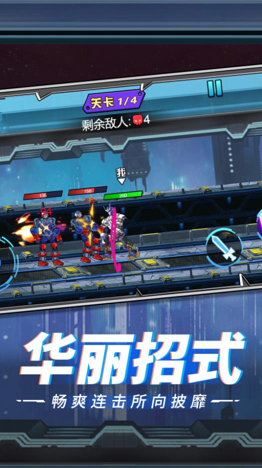 机甲街霸赛是一款动作类型的闯关游戏,操控你的机甲,开始一场精彩的战斗,最为硬核的动作招式,都是可以在你手中一一完成,展现出不一样的威力来,随时都要面对大量的敌人,已经未知的挑战,还有强大的boss在等待着你,一定要小心一点,发挥出自己的操作技巧,运用各种方式,战胜你的强敌,获取最后的胜利,最为劲爆的战斗过程,快来一起体验吧!
