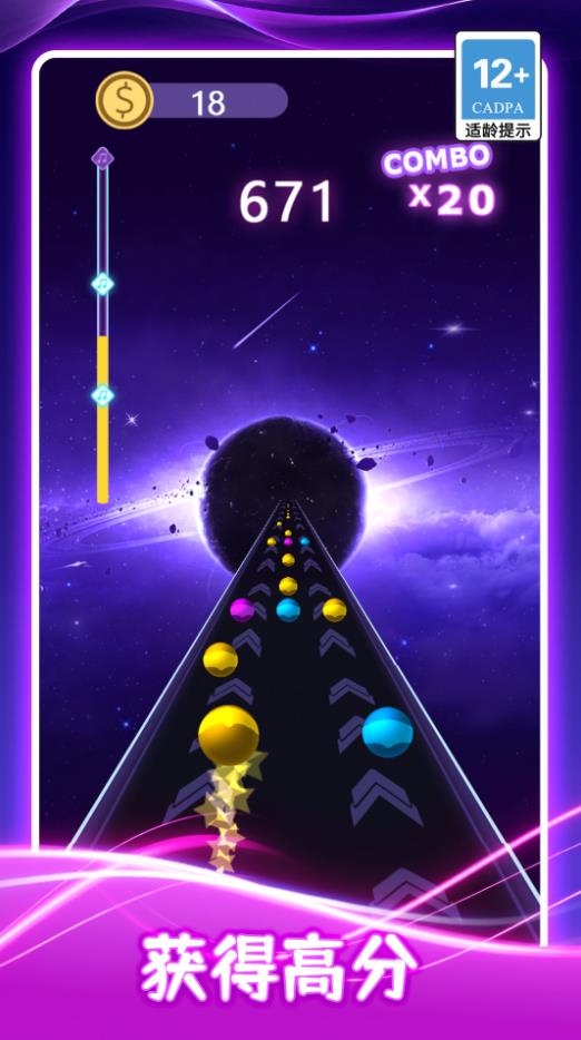 音球漫游曲是一款音乐类型的竞速游戏,一场速度上的挑战,沉浸在各种各样不同的曲目当中,每一首的风格以及节奏都是不太一样的,开始全力奔跑,一直向前就好,享受更多的惊喜滋味,控制好你的小球,在赛道当中不断躲避,同时还要吃掉大量的金币,这样才能让你的评价变得更高,也能获取到更高的分数,和其他选手一起同场竞技,好好表现,争取获得更好的成绩!