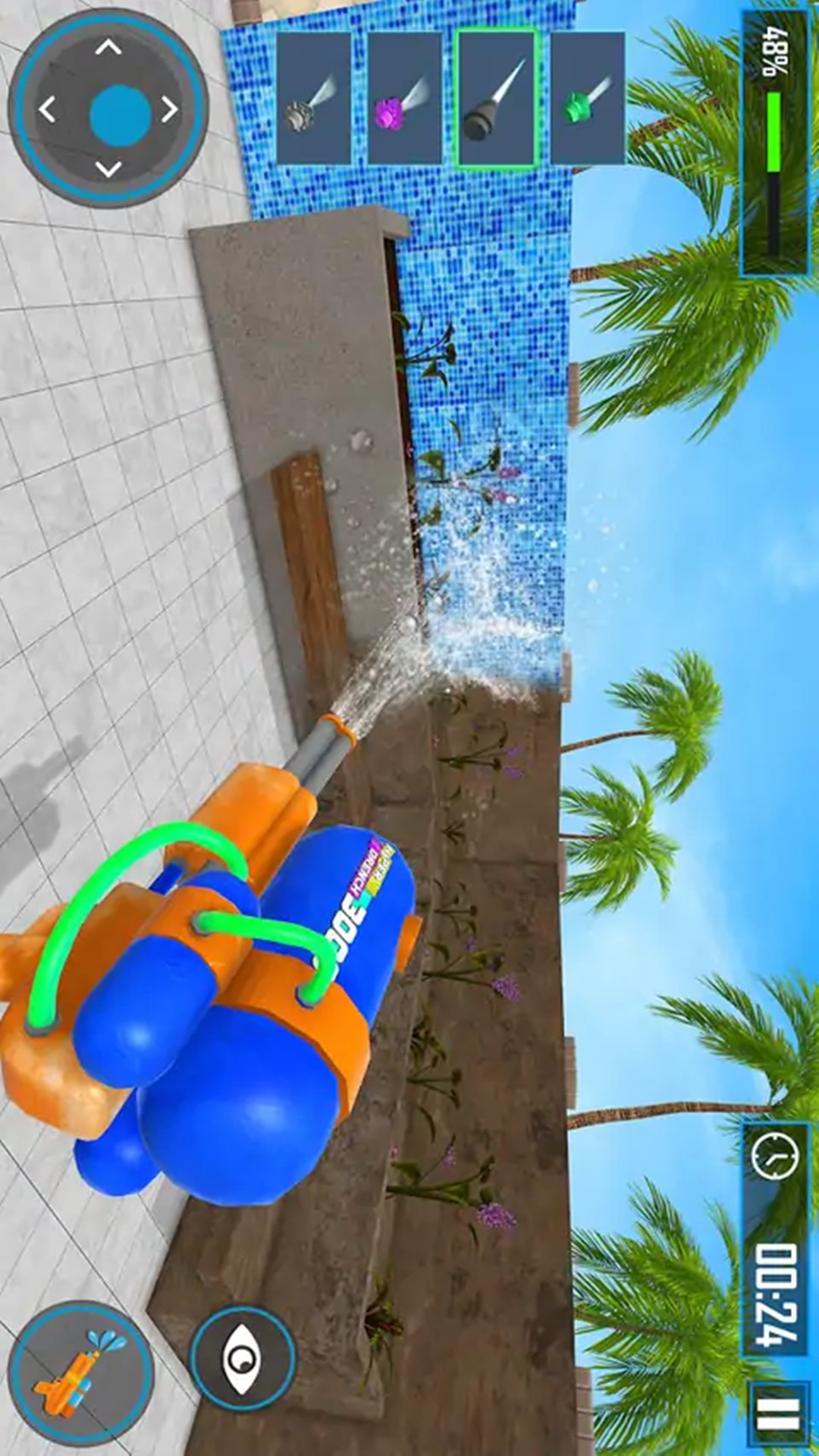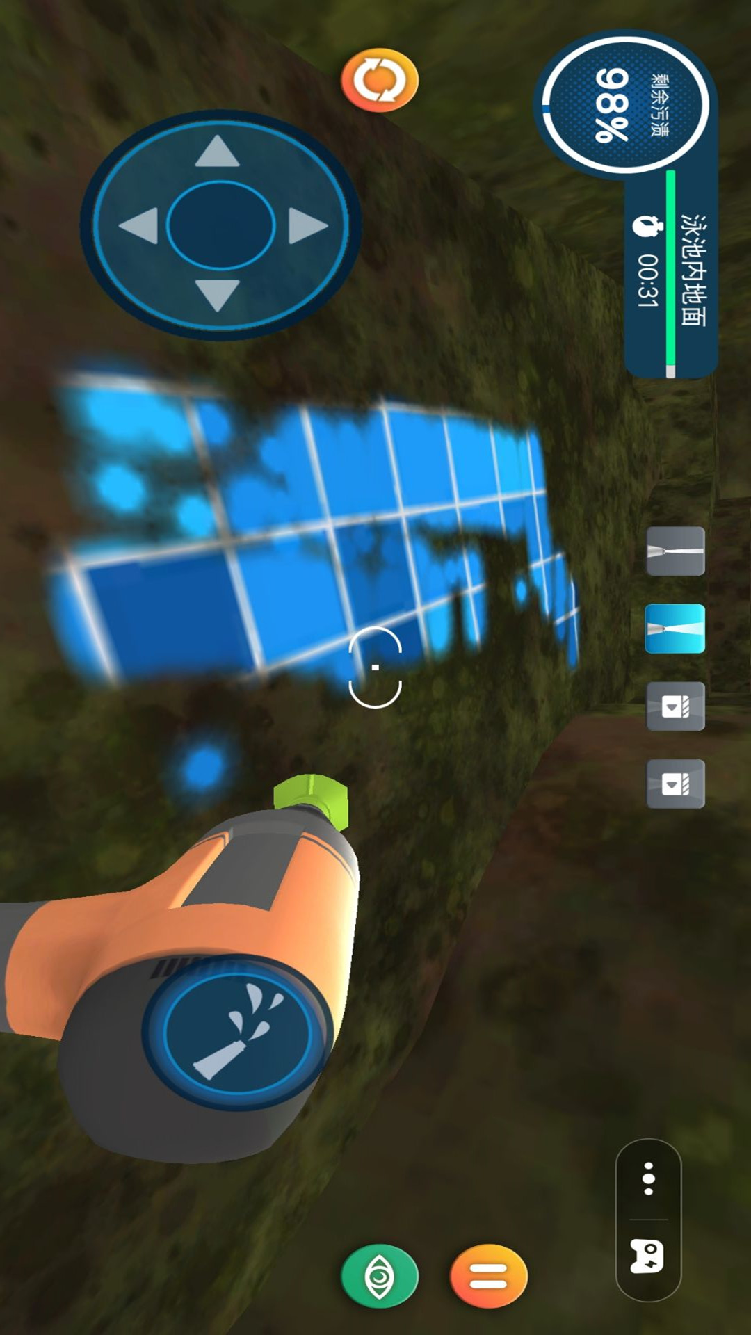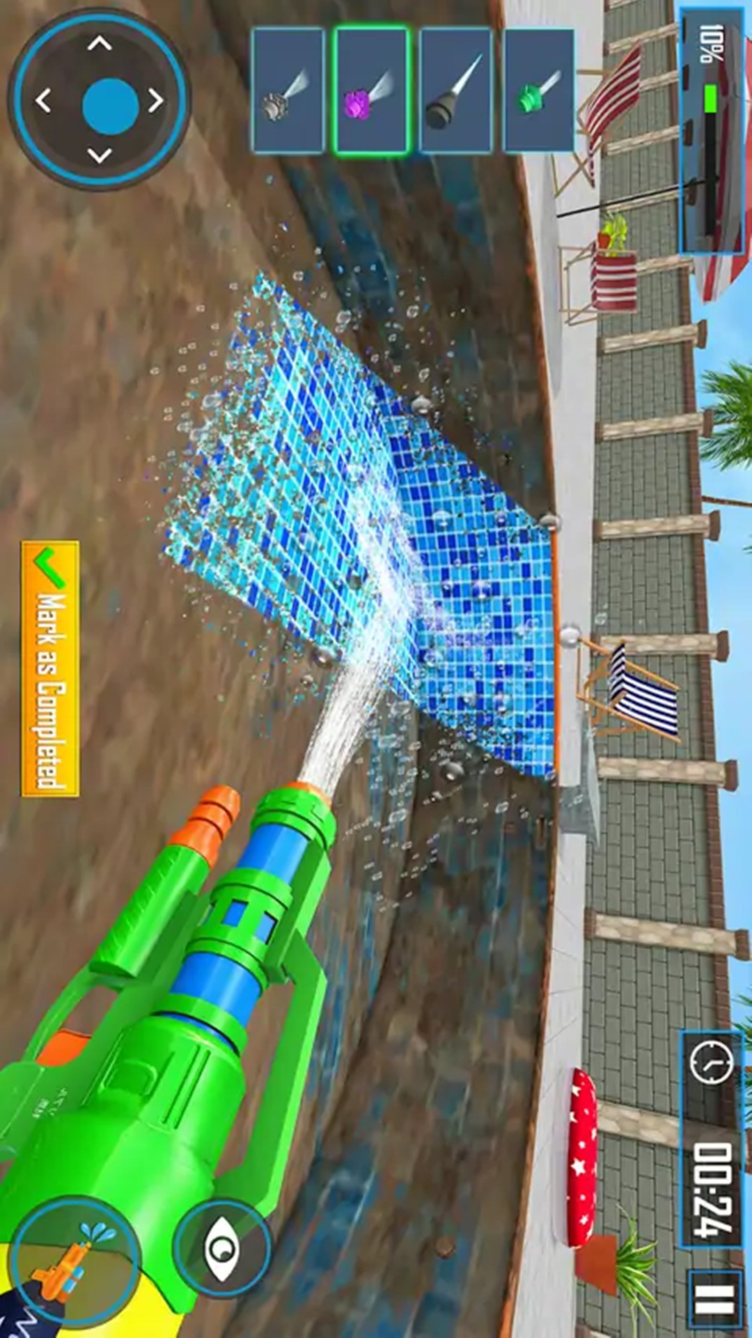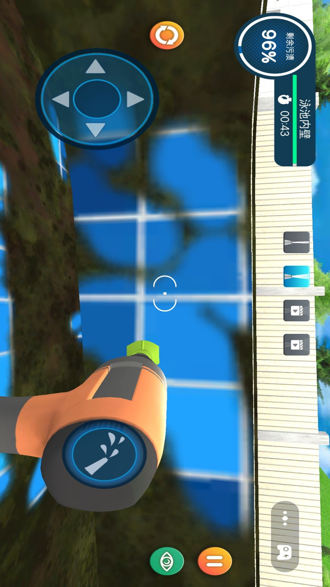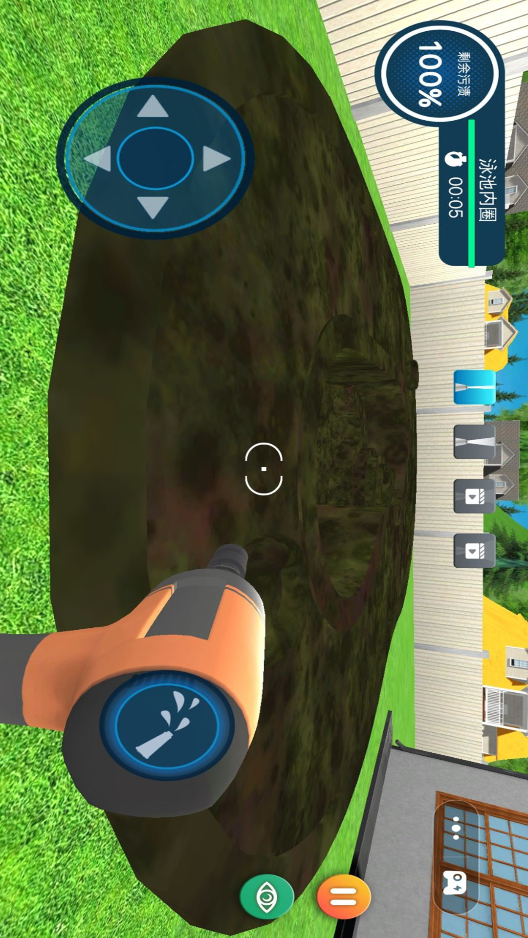冲洗大挑战是一款拿着水枪等工具疯狂冲洗脏污的休闲模拟游戏,采用先进的物理引擎,模拟出逼真的水流动态。水波荡漾、流动和溅起的效果都达到了几乎以假乱真的地步,使得整个清洁过程既有趣又充满挑战。玩家在使用工具清洁泳池时,可以直观地感受到水流对清洁效果的影响,例如水流会带动污垢移动,需要玩家灵活调整清洁策略,完成清洗挑战。