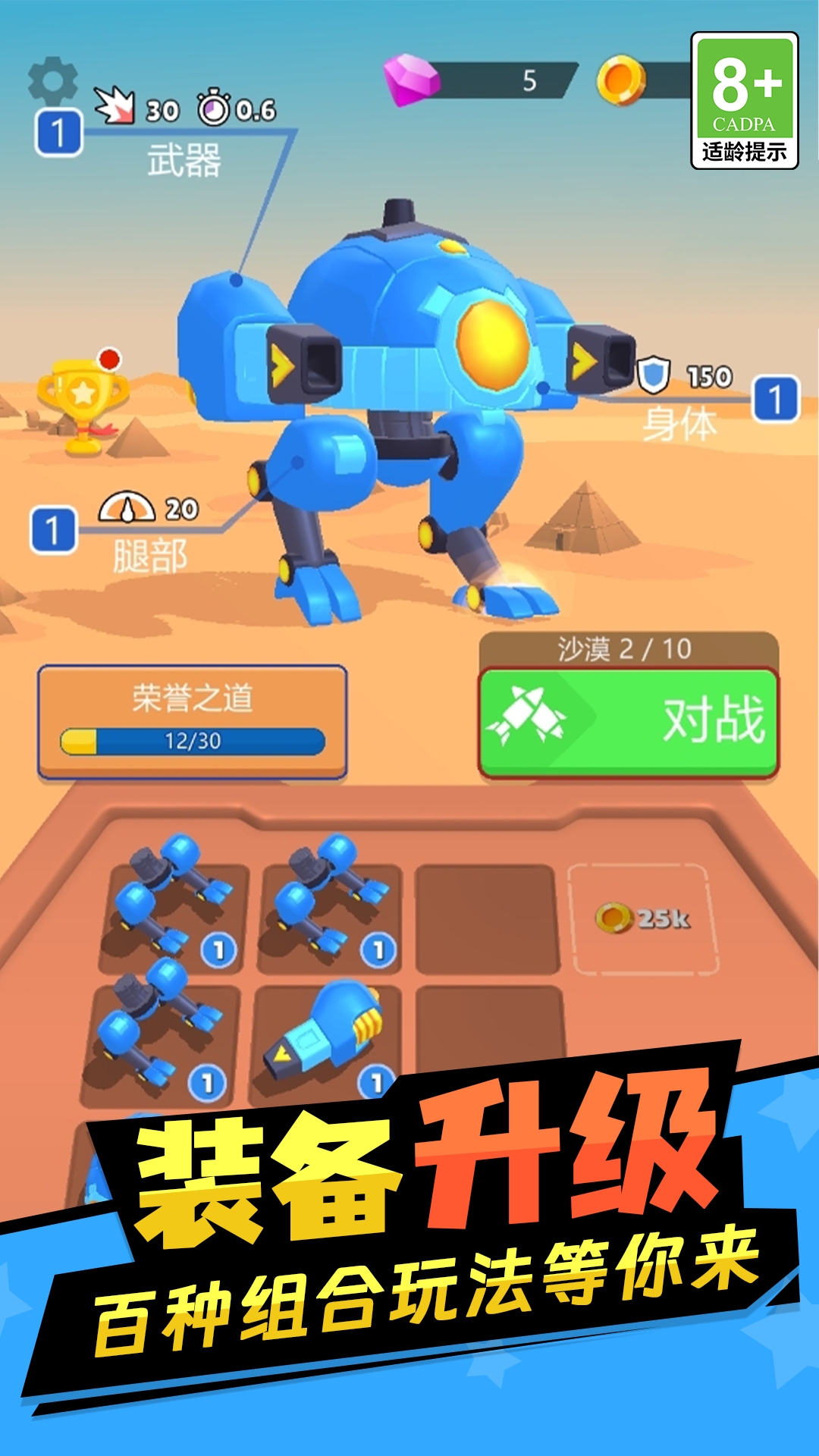 1、可自由选择已购买的零件组装机甲,不同零件组合影响机甲外观与属性,如重型装甲加高射炮等于坦克型机甲;