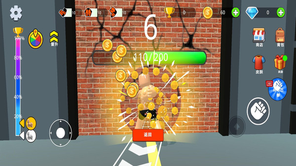 3、当体力耗尽的时候,点击右侧跳跃按钮可以从高空跳下,攀爬越高获得金币越多。