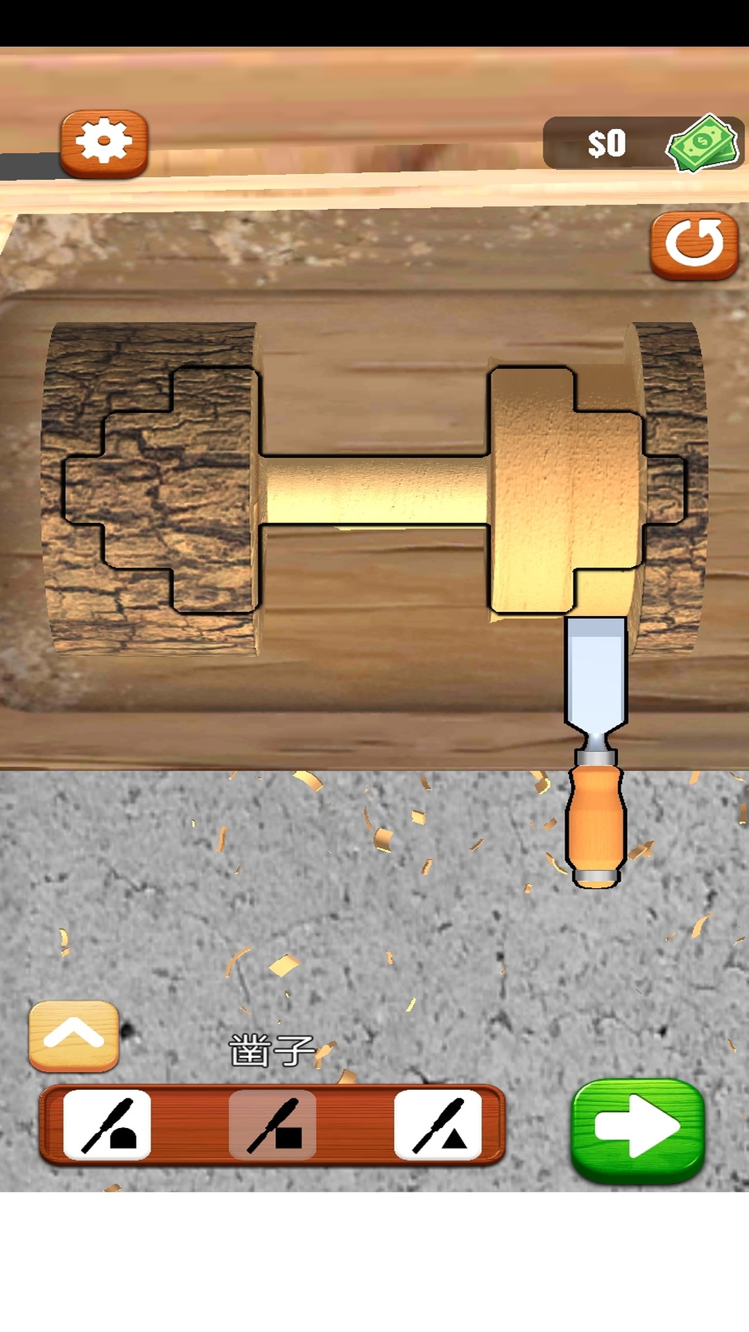 2、削木头的动态效果,如木屑飞溅、木材逐渐成型,通过流畅的动画呈现,配合逼真的音效,强化了操作的真实感;