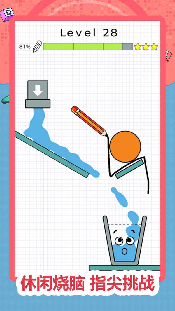1、点击屏幕任意地方可以绘制线条,根据关卡设定,让水顺利流到杯子即可。