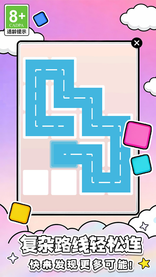2、每个关卡都是一幅独特的网格拼图,从基础的方形到复杂的异形布局,结构经过巧妙计算。