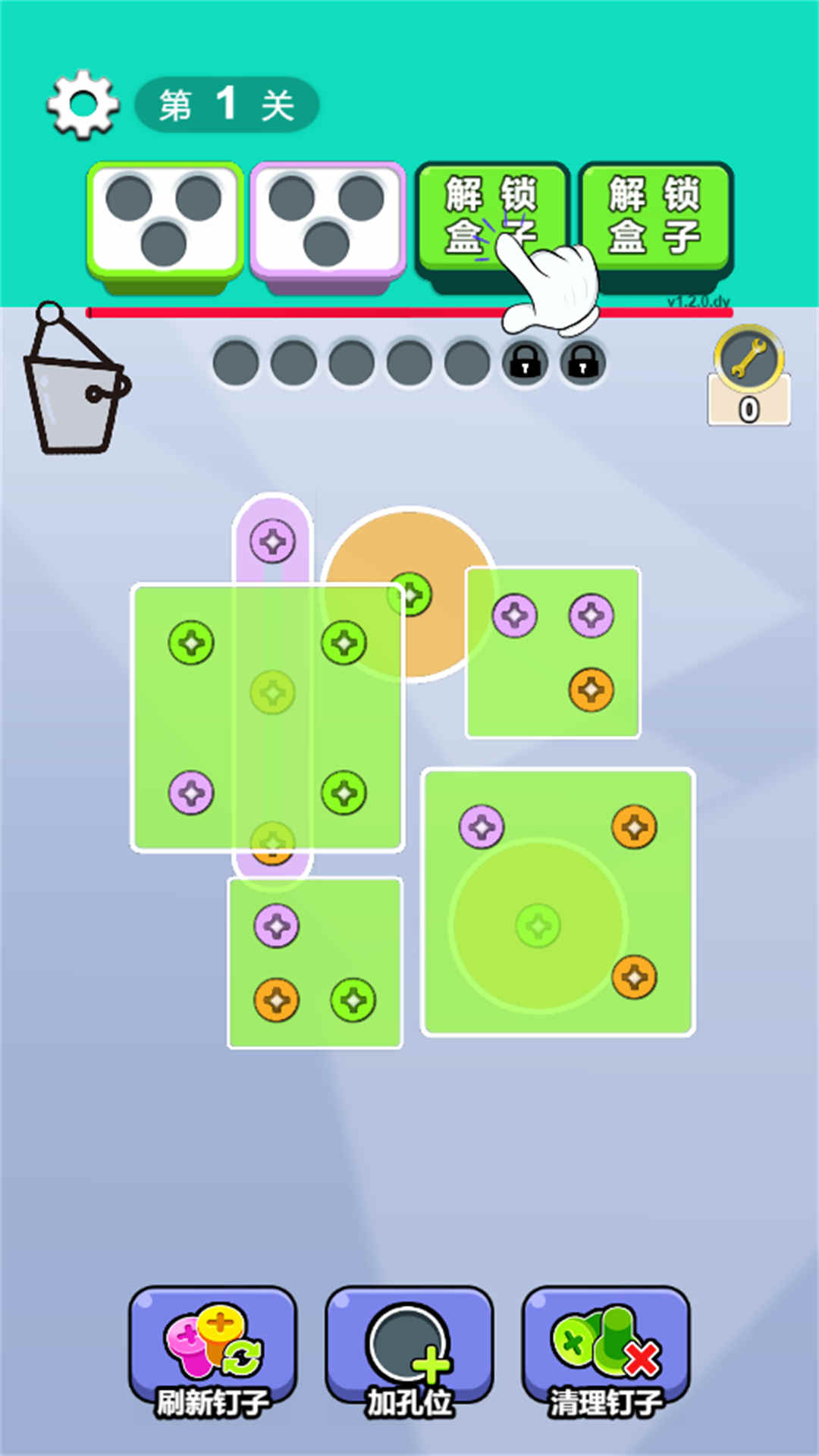 1、进入游戏,点击不断的拆除不同的颜色的螺丝,放置相应颜色的盒子上,三个即可消除。