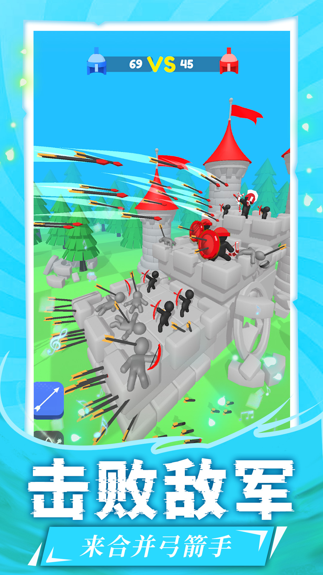 2、初入游戏时,你会拥有基础弓箭手单位。相同等级的两个弓箭手可合并升级为更高级兵种,属性全面提升。