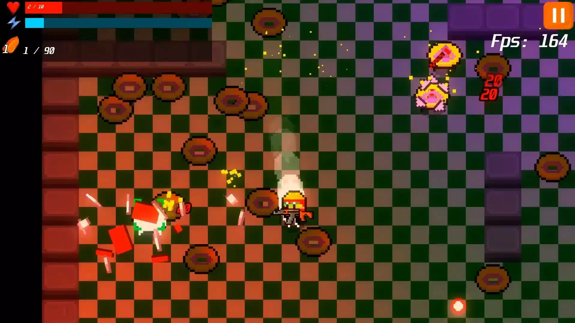 1、使用虚拟摇杆控制汉堡移动,另一摇杆瞄准方向,点击屏幕发射或挥砍攻击。