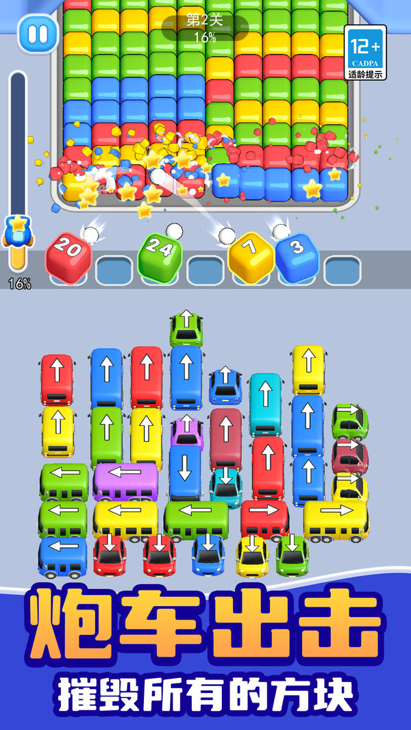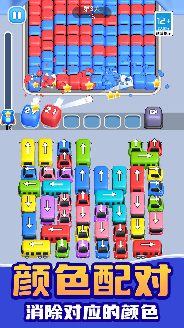 1、根据上方方块的布局,点击下方对应颜色的车辆开出停车场,自动射击上方方块消除。