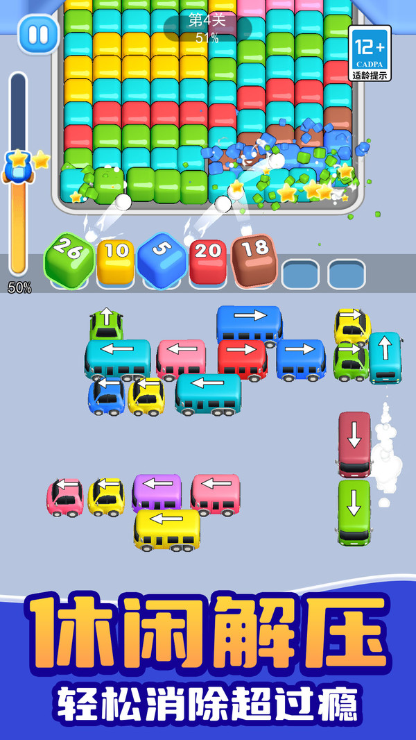 3、游戏节奏舒缓,没有时间限制。成功疏通所有车辆、清空方块的那一刻,能带来强烈的秩序感与解压满足感。