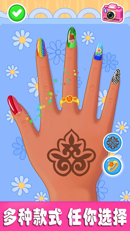 2、游戏中拥有超过数百种指甲油颜色、装饰贴片与立体饰品可供自由选择搭配,创造出独一无二的美甲款式。