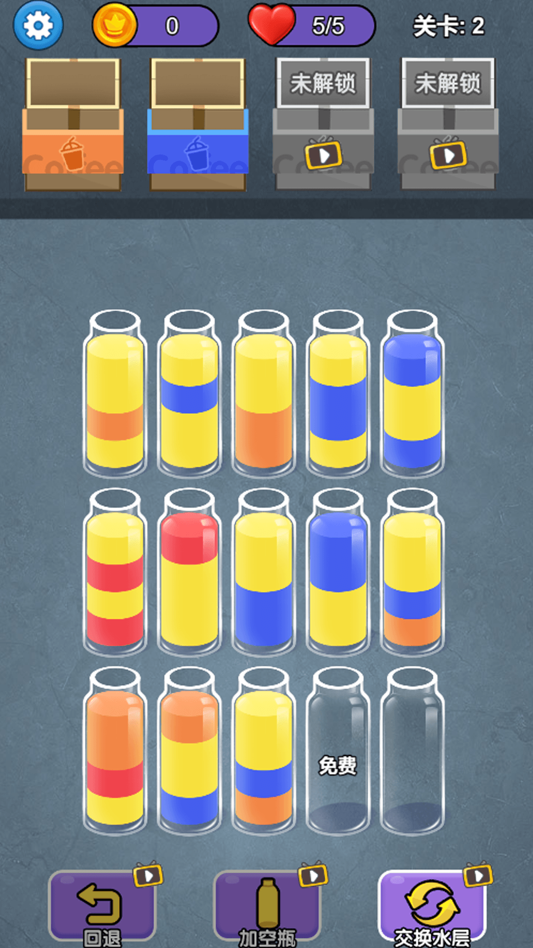 3、不断的倒入新的水瓶,玩法简单有趣,轻松有趣的益智玩法,玩法十分的简单。