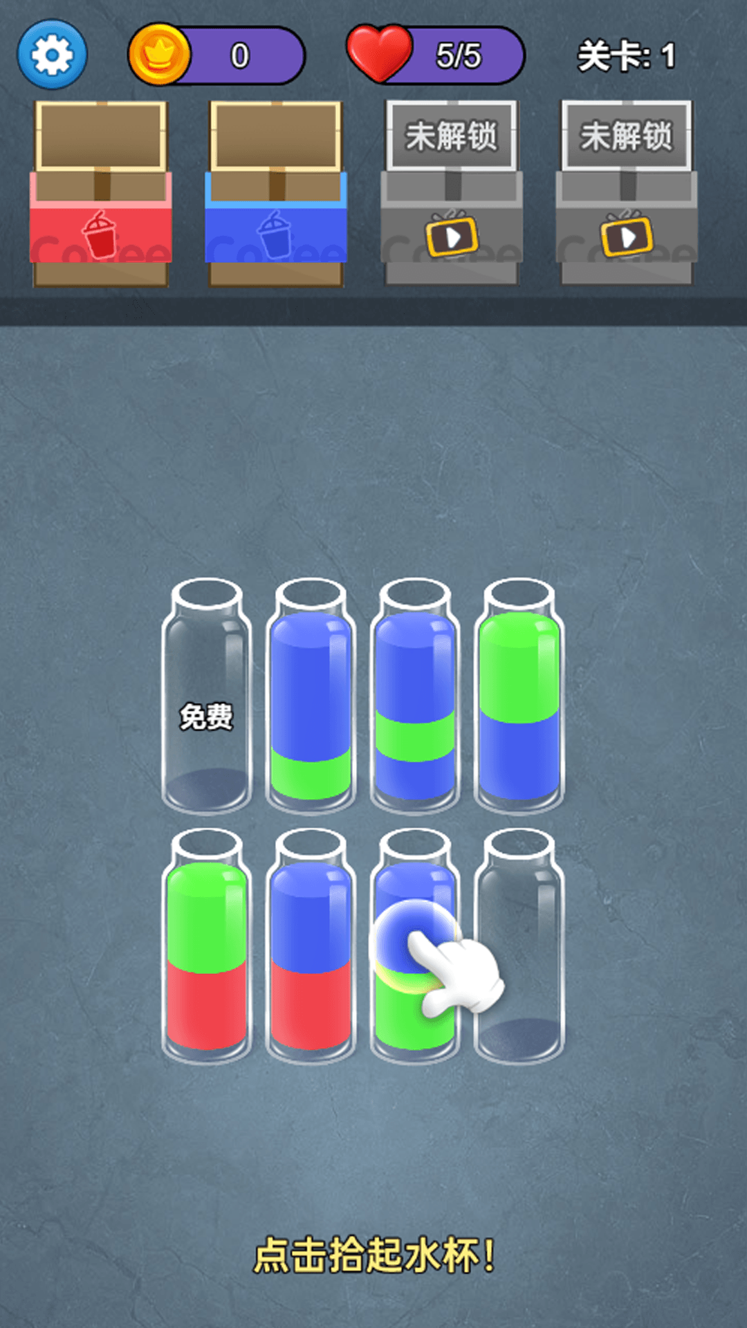2、继续的倒水,每关都有指定的目标任务,根据出现的颜色的水瓶进行消除。