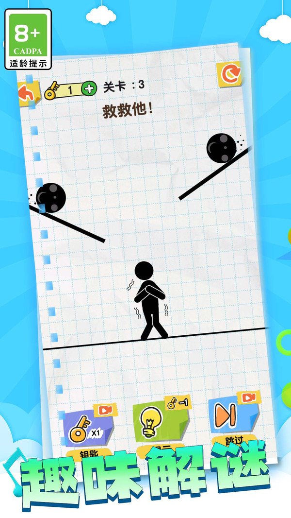 2、线条与场景元素的互动结果即时、直观。火柴人获救或失败时的趣味动画,增添了轻松幽默的喜剧效果。