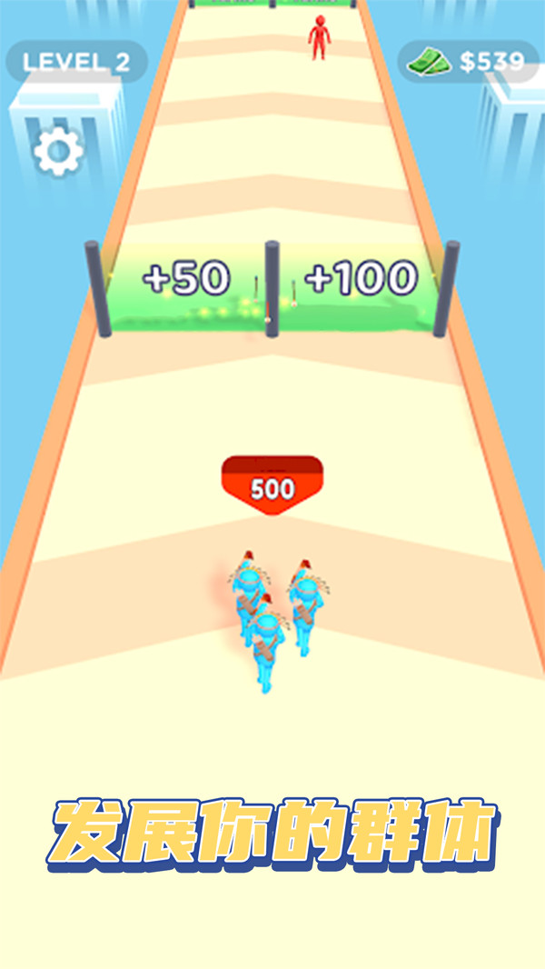 1、点击屏幕左右滑动,控制角色在跑道上移动穿过一个个增长属性的门。