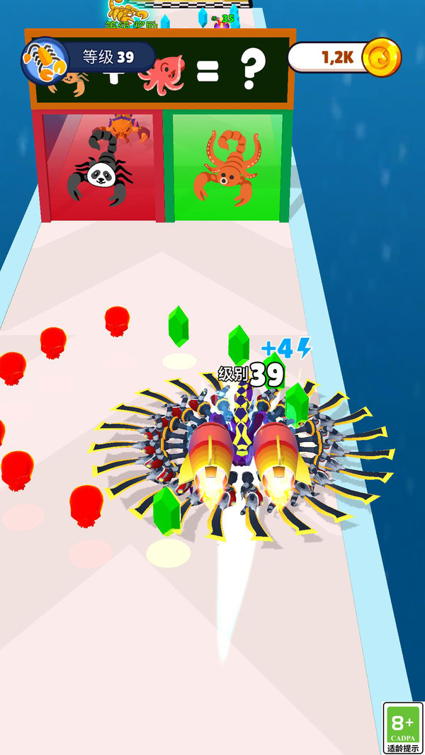 1、点击屏幕开始关卡挑战,左右滑动控制你的蝎子移动,在场景中收集蝎子进行进化。