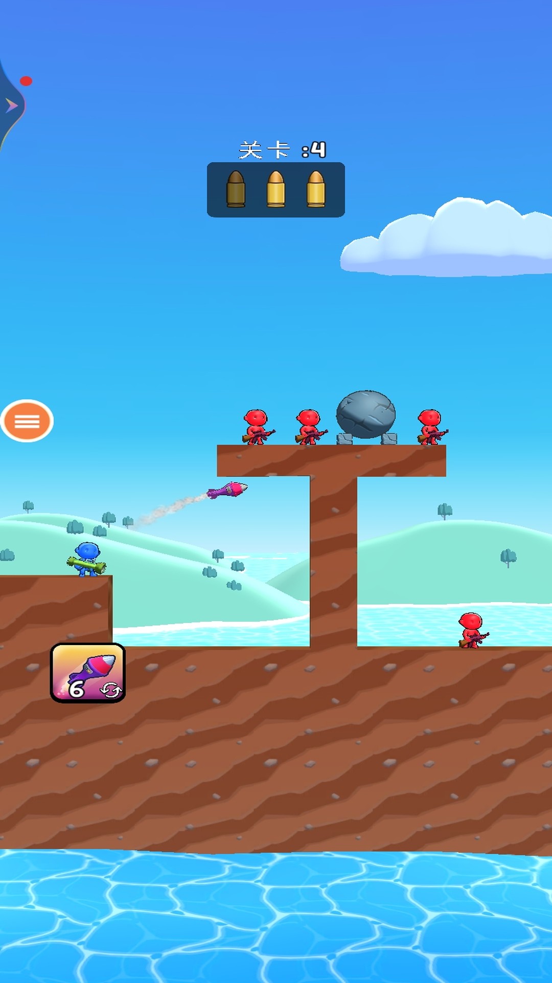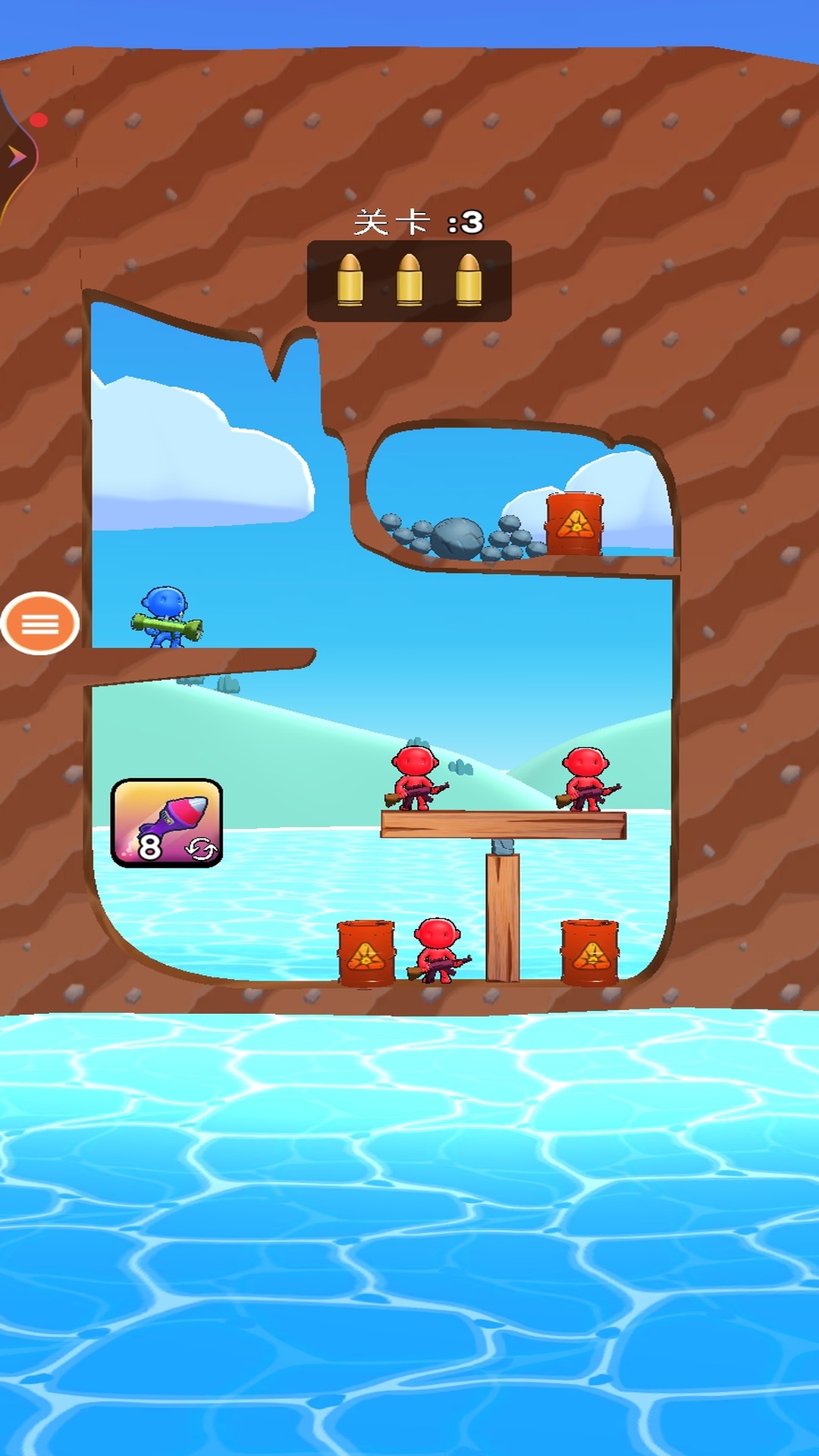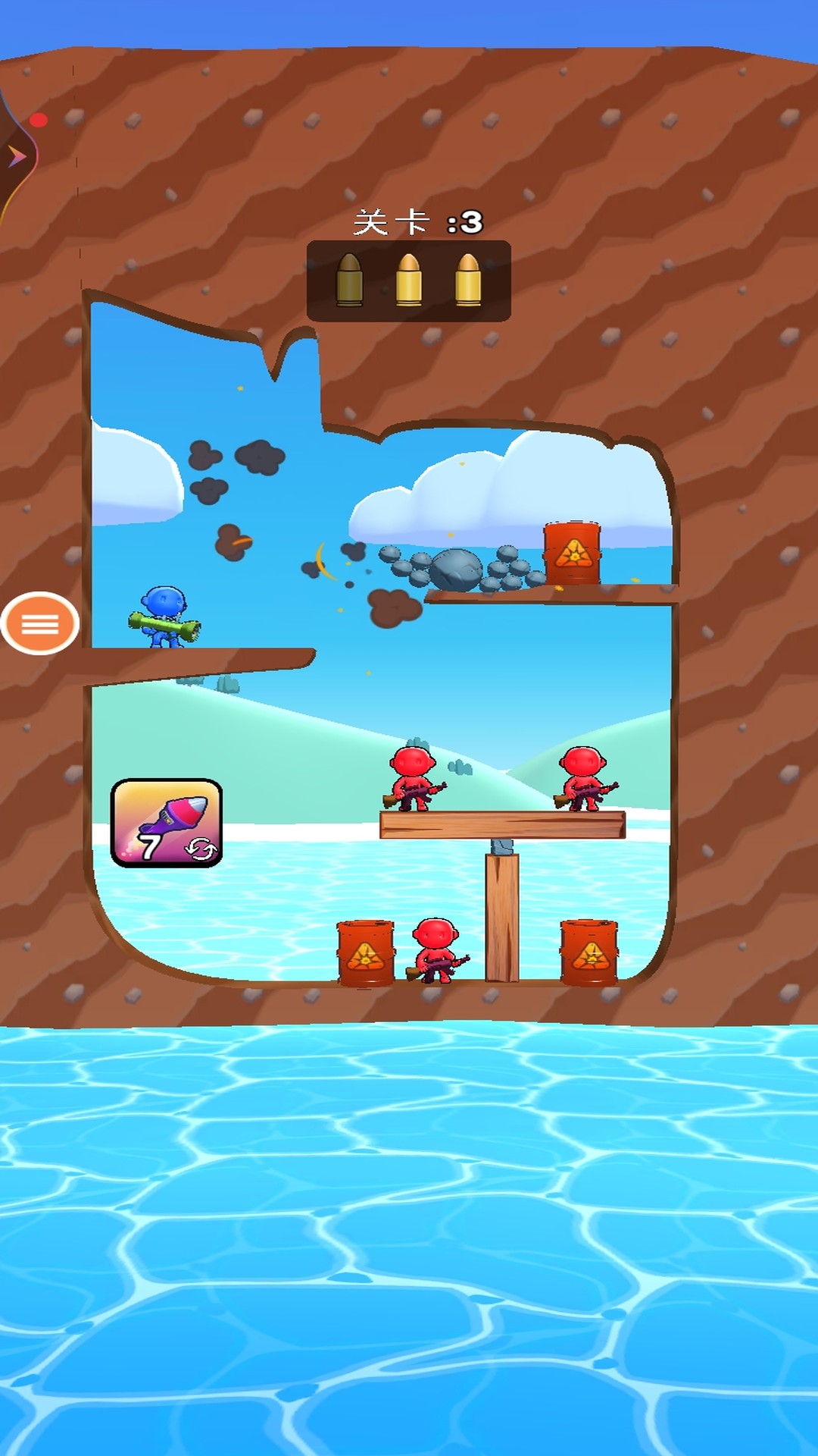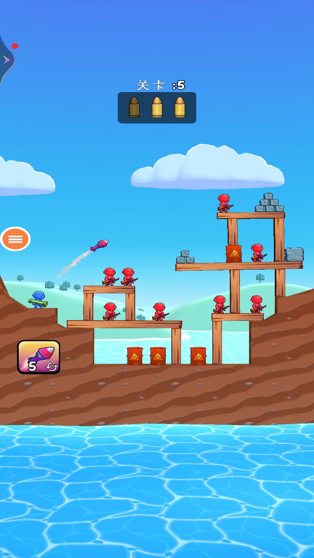 3、发射手榴弹射击平衡木,精准的打击周围的敌人,敌人的数量逐步的增多,射击周围的物体成功通关。