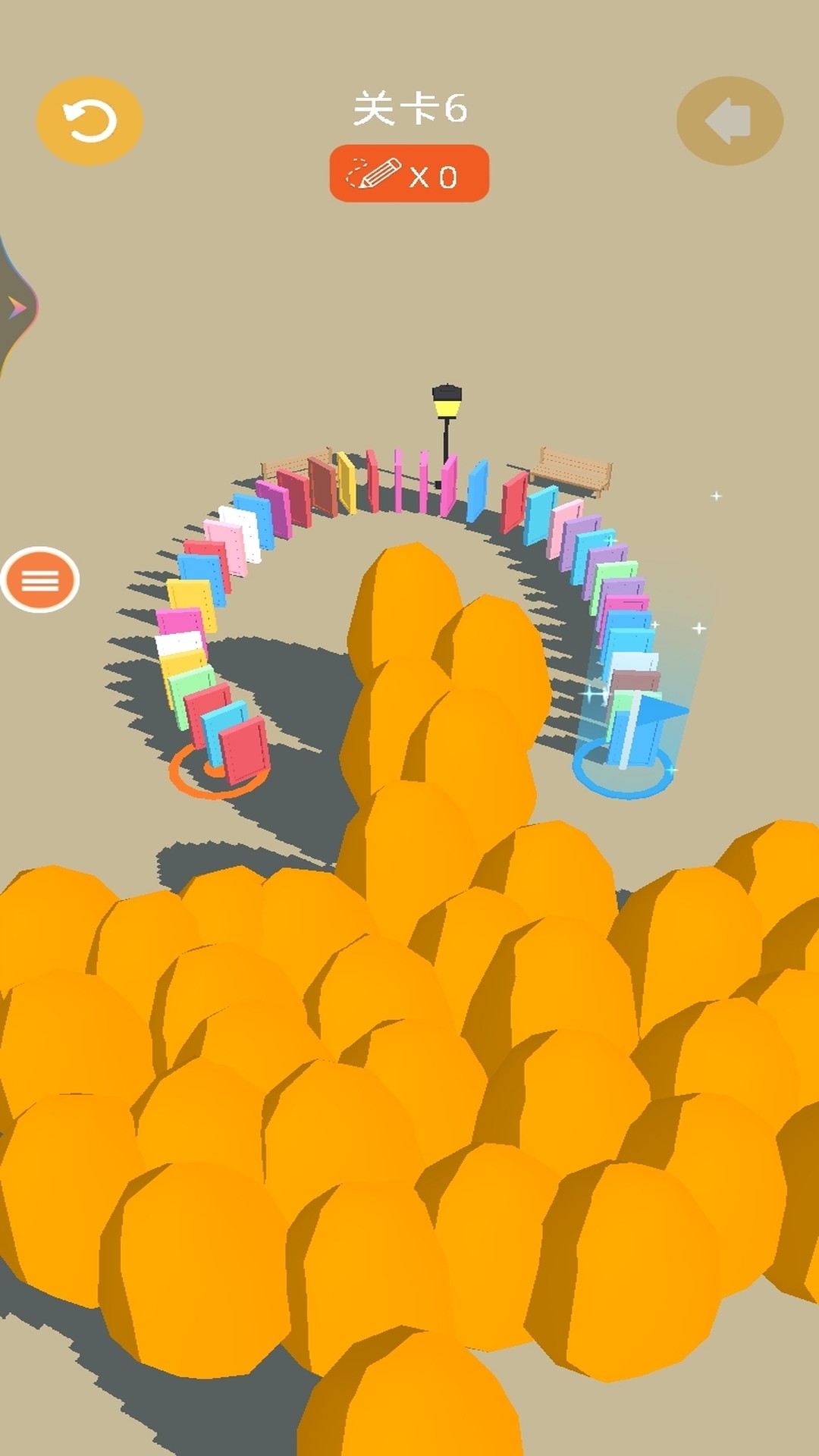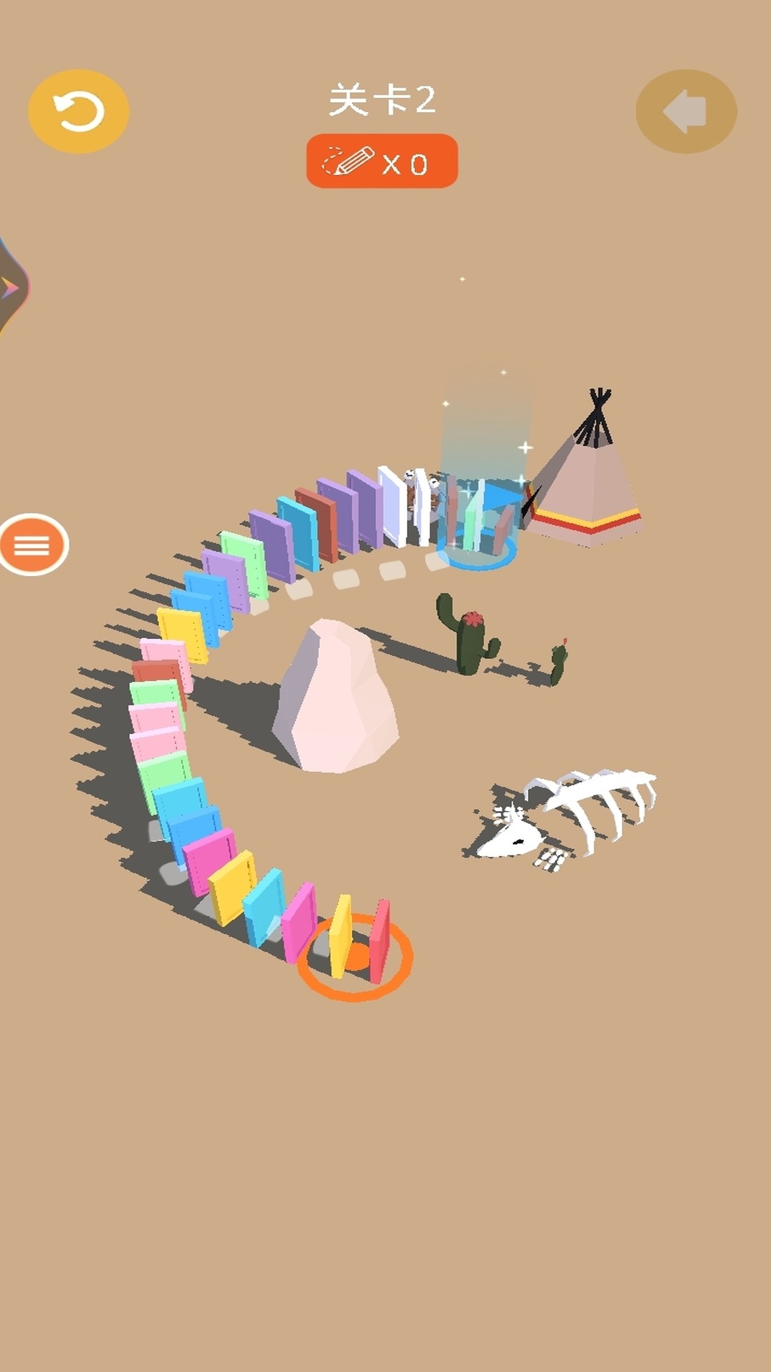 2、每一关都是一个独立的物理谜题。玩家需要综合考虑骨牌的间距、排列角度、初始推力方向以及关卡中的障碍物。