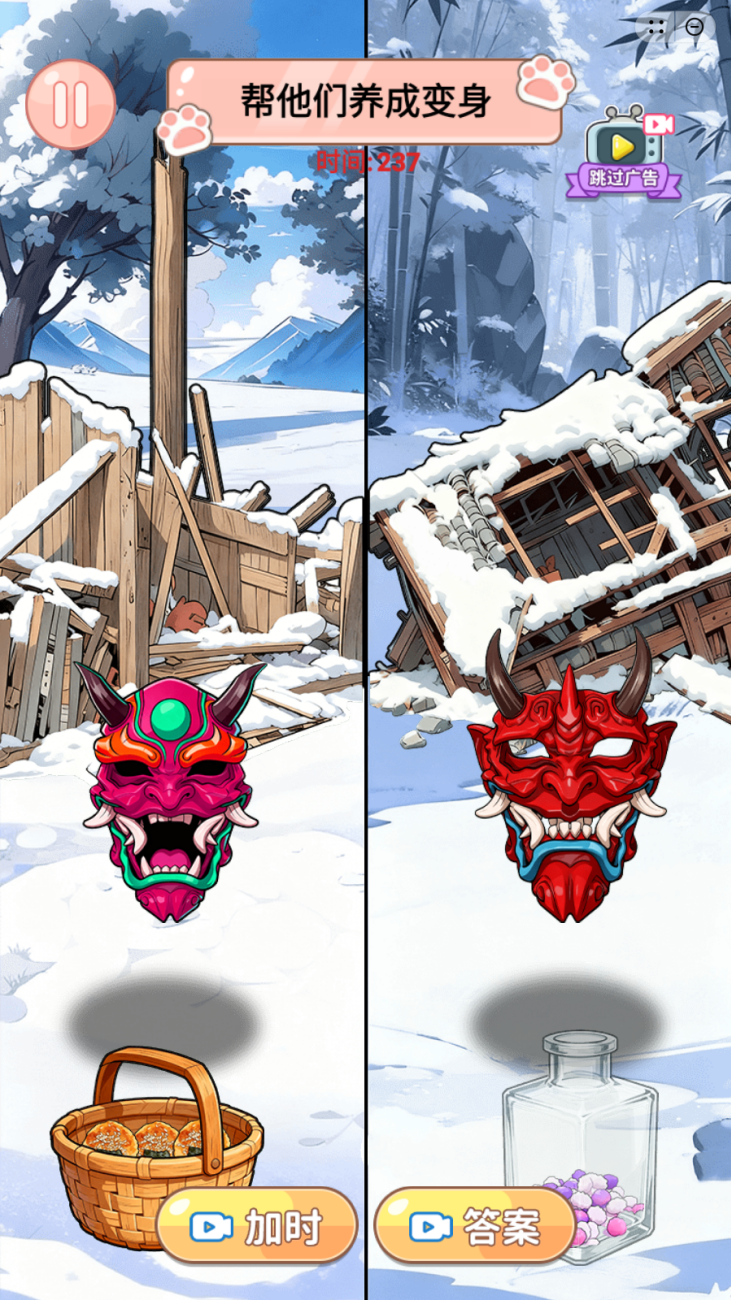 脑洞来过关是一款左右进行正确选择的休闲闯关游戏,以投喂物品助力角色变身为核心玩法,带来意想不到的惊喜体验。玩家需精准匹配角色需求,投喂特定食物或道具以触发变身,赋予角色丰富的成长层次与视觉惊喜。变身后的面具形态与萌化造型进一步放大这一特质,如动物耳朵、奇幻装饰等元素,既符合脑洞主题,又满足玩家对萌系内容的审美需求。