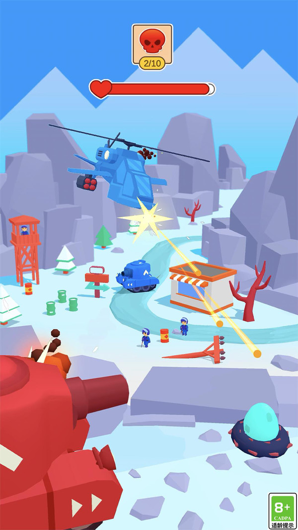 3、每个场景中的敌人类型不同,可能是飞机、坦克、士兵等,操控坦克全部击杀。