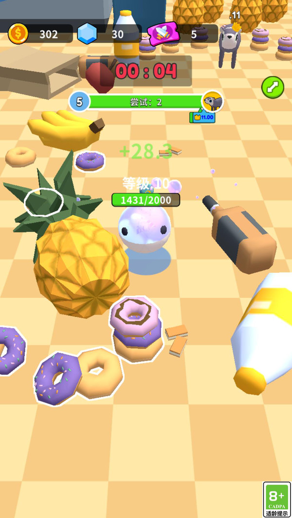 1、点击屏幕开始关卡挑战,滑动屏幕控制史莱姆在场景移动,吞噬比你体型小的物体。