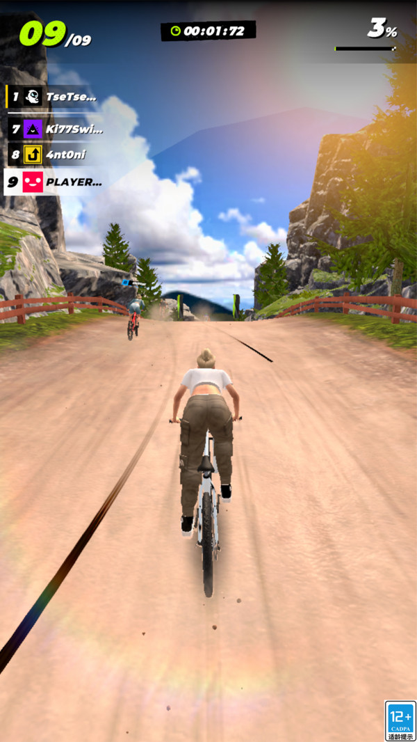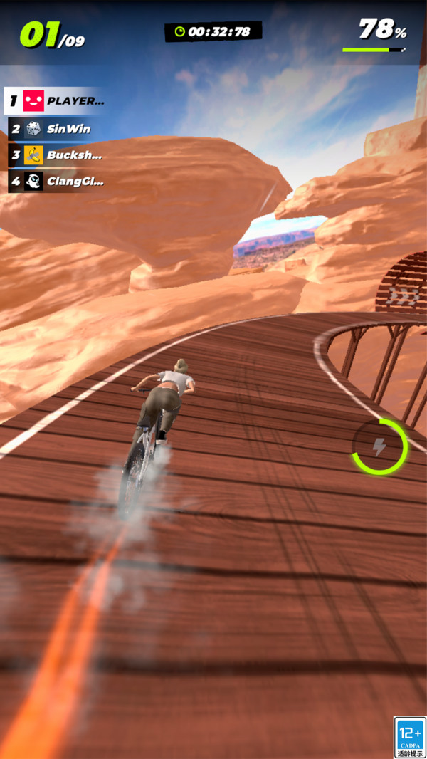 3、在关卡中,不断的骑行能积攒冲刺能量,使用冲刺能快速超越对手。