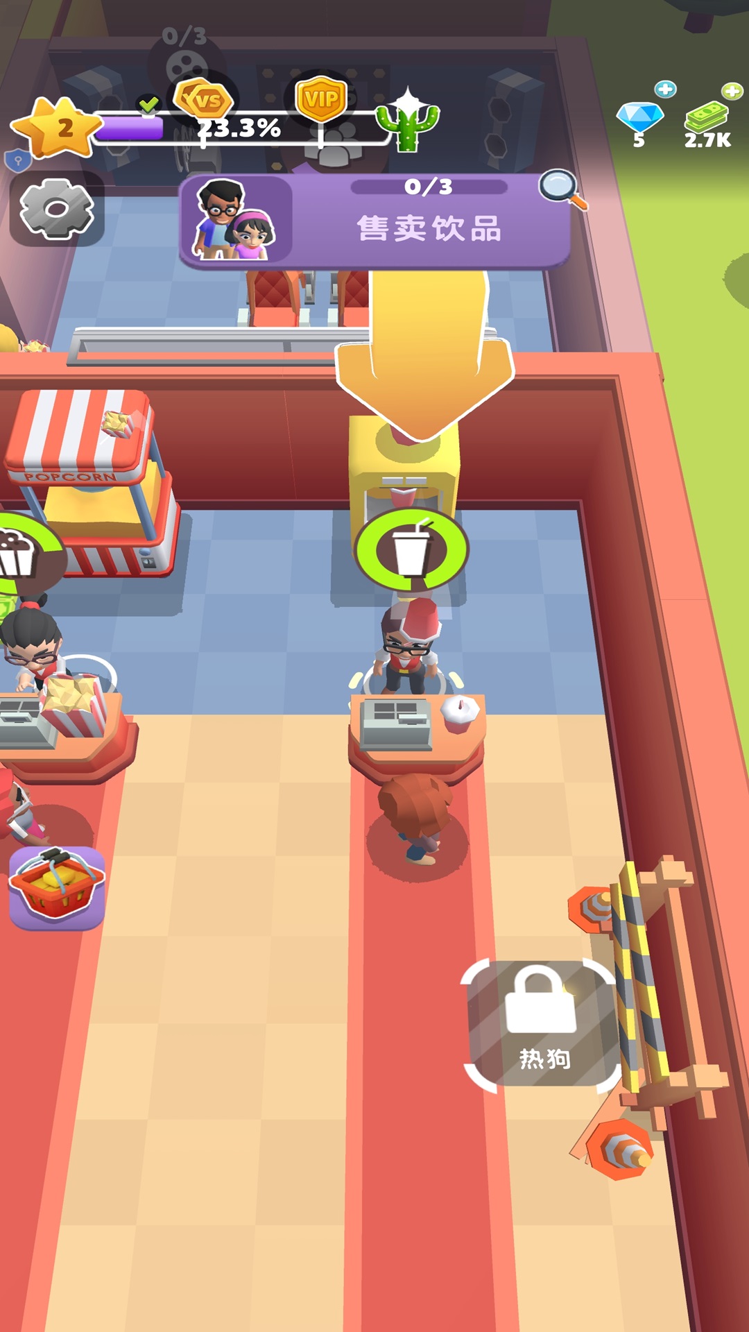 2、服务顾客赚取丰富的金币,每个影院只能容纳三个顾客,所以需要等待。