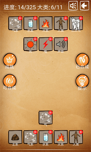 1、首先,玩家可以从上方与下方排列格子选择一个元素来进行合成;