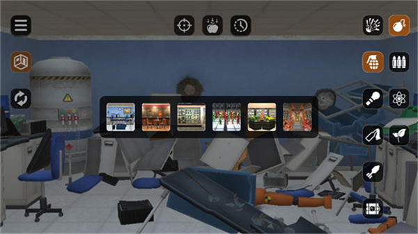 6、中间上方的按钮则分别是,瞄准、重力控制、和时间,右边则是所有破坏房间的方式,有炸弹、子弹、科学/物理、和大自然,其中炸弹也有许多不同的类型可选;