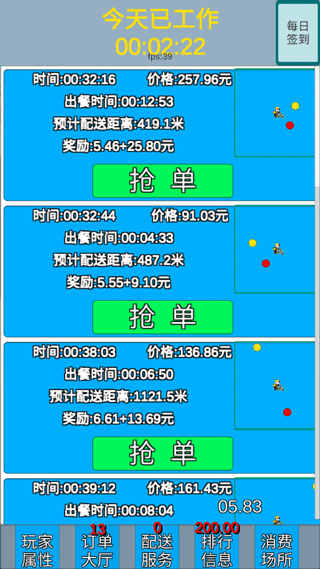 1、以文字的形式体验外卖小哥的日常工作和生活,当在送外卖过程时,需要去抢单,一次能抢到多个订单;