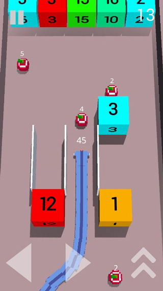 2、利用点击屏幕跳跃来躲避方块,如果不小心碰到了数字方块的话会让自身长度和头上的数字消耗来撞击方块;