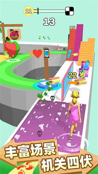 2、一路奔跑还可以收集各种道具,让角色保持年轻,同时面对各种障碍挑战;