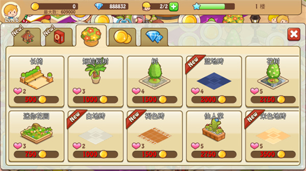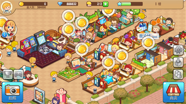 1、设施种类多,店铺可多次升级,餐厅、烘培、服装、电玩中心随便搭;