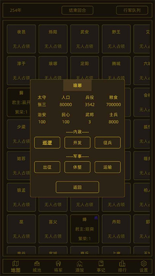 5、在名下的领地内可以进行赋税收粮,招兵买马等加强国力的行为;
