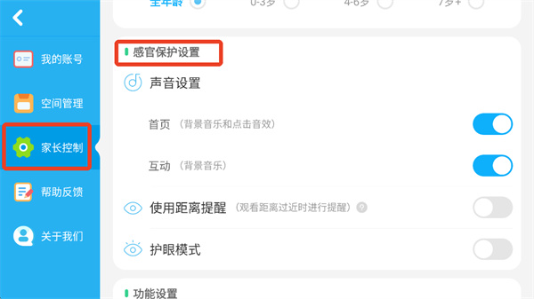 6、点击左边的家长控制,下滑找到感官保护设置;