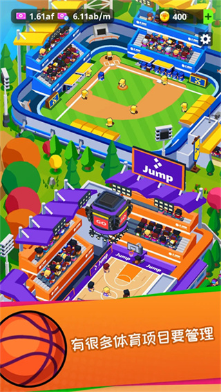 2、面对各种的任务挑战,靠自己赚取回来的金币去建造每个建筑物,为体育场添加各种的体育项目;