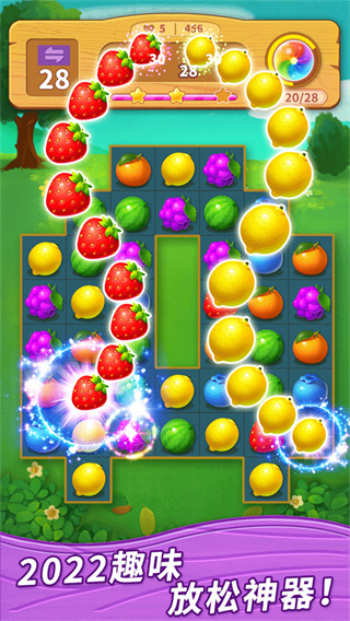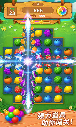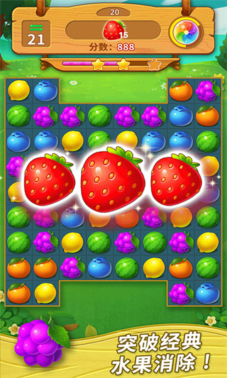 1、只需要把三个一样颜色的水果结合在一起就可以完成消除,玩法简单又容易,适合所有年龄的人群当休闲游戏玩;
