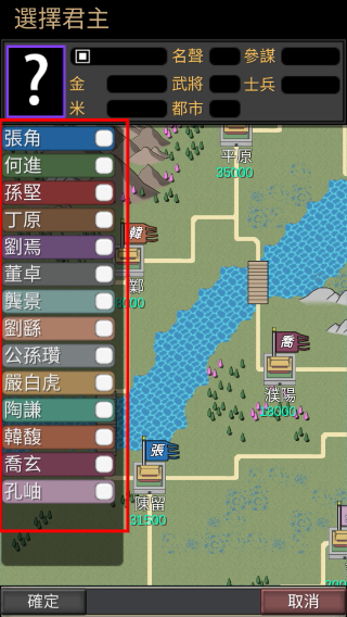 2、君主选择列表,挑选心仪的君主势力,确认后点击确定,进入对应势力的大地图界面。