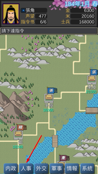3、大地图界面,点击人事按钮,打开武将操作菜单,进行武将相关的管理操作。