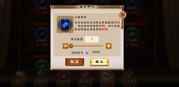 3.还有一种能帮你打时间差的锦囊,叫“以逸待劳”,它能让你出征部队里武将的血量提高20%,伤兵的救治率也提高20%,但代价是行军速度会降到原来的一半。