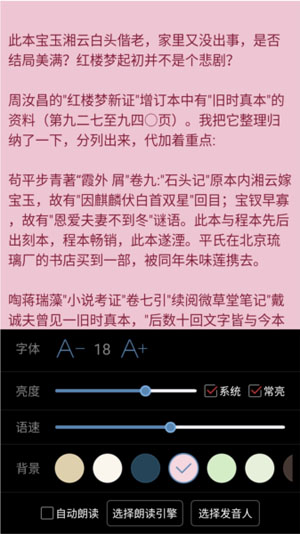 用户可以根据自己的阅读偏好自由调节字体大小、背景、朗读语速等。