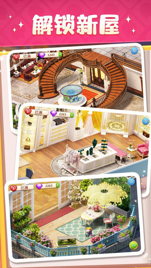 玩法结合了经典三消目标闯关,随着消除任务推进收集装饰素材,再根据自身喜好对各个房间进行个性化装修。