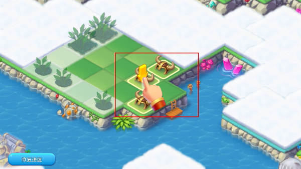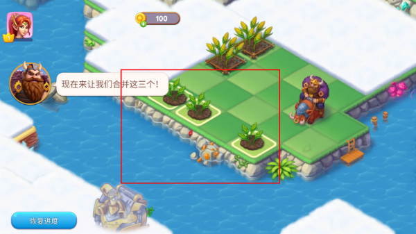 1、按照指引点击对应物品,完成初始操作,解锁地块与道具,为后续种植和合并操作做好准备。