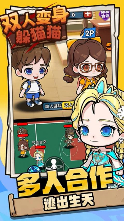 双人变身躲猫猫是一款结合变形伪装以及捉迷藏对抗的创意竞技游戏,玩家分为躲藏者与搜寻者两大阵营展开猫鼠追逐,躲藏者可以利用场景中的物件进行变形伪装,搜寻者则需要通过隐身和攻击观察细微破绽识别出伪装的对手,卡通渲染风格与快节奏的配乐营造出轻松欢乐的氛围,简单易上手的规则下隐藏着心理博弈的深度,每局比赛都时时刻刻有着意想不到的趣味反转。