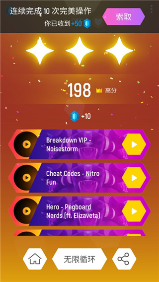 6、 音乐结束,一局游戏也就顺利完成了。这时屏幕上会显示出你的最终得分,并根据你的表现发放相应的奖励,让你充满成就感。