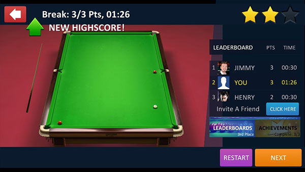 斯诺克全明星是一款逼真的第一人称台球游戏,游戏里还有各种不同的模式可以游玩,可以和好友进行一对一对战看看谁才是台球王者,轮流至的游戏玩法,当击打球没有进就会轮到对手击打,只要优先把对应的球都击打进洞口即可获得胜利,每个球的位置都很分散,需要合理的控制白球的走向来击打更多的球,无网络也可以进行游玩。